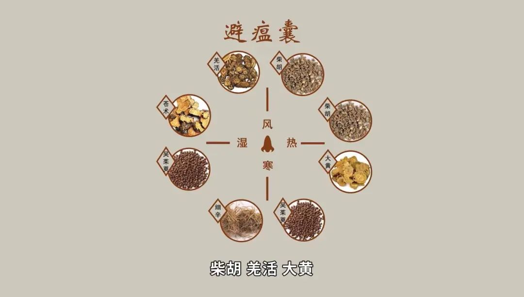 避瘟囊的药方出自《理瀹yuè骈文》,选用柴胡、羌活、大黄、吴茱萸、细辛、苍术六味中药制成,六味药通过四个组合,可以使祛湿的能力得到提高,起到了抵御外邪、保护肌体的作用。