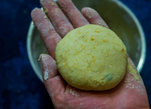 6锅内刷一层油,南瓜面团放入锅内压扁,烙到两面金黄。